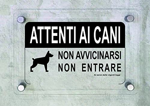 CARTELLO IN PLEXIGLASS SEGNALETICO - Attenti ai cani non avvicinarsi non entrare - Con Distanziali in acciaio inox e Stampa U.V. (15X21 cm)