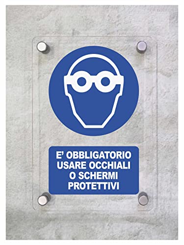 CARTELLO IN PLEXIGLASS SEGNALETICO - E' OBBLIGATORIO USARE OCCHIALI O SCHERMI PROTETTIVI - Con Distanziali in acciaio inox e Stampa U.V. (15x21 cm)