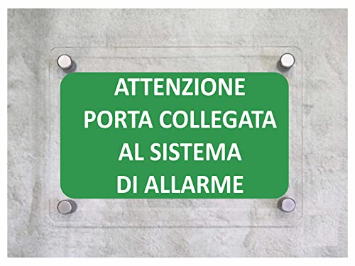 CARTELLO IN PLEXIGLASS SEGNALETICO - PORTA COLLEGATA AL SISTEMA DI ALLARME - Con Distanziali in acciaio inox e Stampa U.V. (21x30 cm)