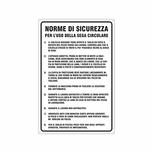 NEW CARTELLO SEGNALETICO - Norme di sicurezza uso sega circolare - Adesivo Extra Resistente, Pannello in Forex, Pannello In Alluminio (ADESIVO 20X31 CM)