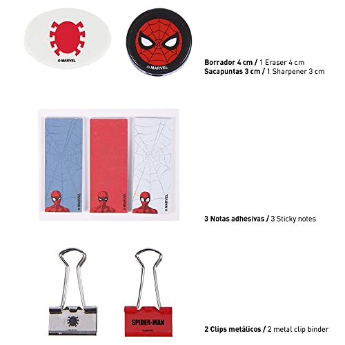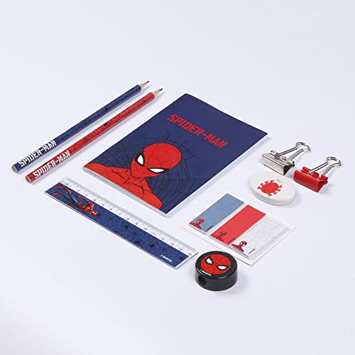 CARTOON Set cancelleria, 12 pezzi, block notes, matite, accessori, tombolino, idea regalo (Spiderman)
