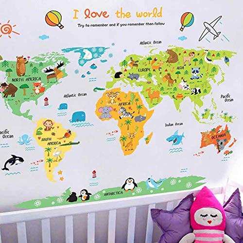 Cartoon Safari Animals World Map Nursery Wall Stickers for Kids Room Decoration Letters Global Maps