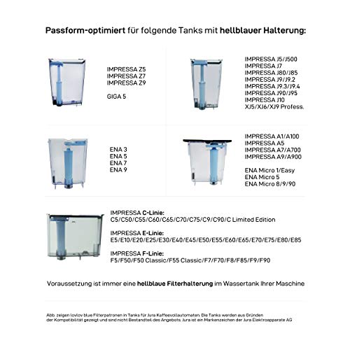 Le cartucce filtranti Lovlov Blue si adattano solo alle macchine da caffè Jura che utilizzano il filtro blu Jura Claris Blue. Se la macchina ha bisogno di un filtro grigio o bianco, il nostro filtro non è compatibile. Si prega di verificare prima di procedere con l'ordine sulla base del manuale o sul sito web di Jura sotto il cavaliere "Prodotti per la cura". Nella foto del nostro filtro troverete una panoramica del serbatoio dell'acqua in cui si adatta il lovlov Blue.