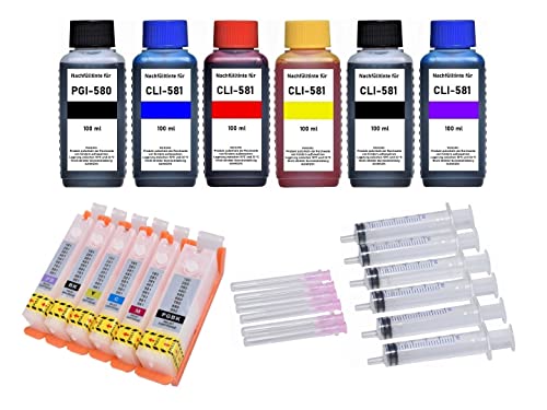 6 cartucce ricaricabili PGI-580 XXL, CLI-581 XXL con chip (auto) reset + 6 x 100 ml di inchiostro nero, ciano, magenta, giallo, nero fotografico, blu fotografico + accessori per il riempimento