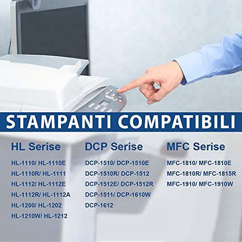✅ Stampanti BROTHER Compatibili: HL-1110, HL-1110E, HL-1110R, HL-1111, HL-1112, HL-1112E, HL-1112R, HL-1112A, HL-1200, HL-1210W, HL-1202, HL-1212, DCP-1510, DCP-1510E, DCP-1510R, DCP-1512, DCP-1512E, DCP-1512R, DCP-1511, DCP-1610W, DCP-1612, MFC-1810, MFC-1810E, MFC-1810R, MFC-1815R, MFC-1910 e MFC-1910W