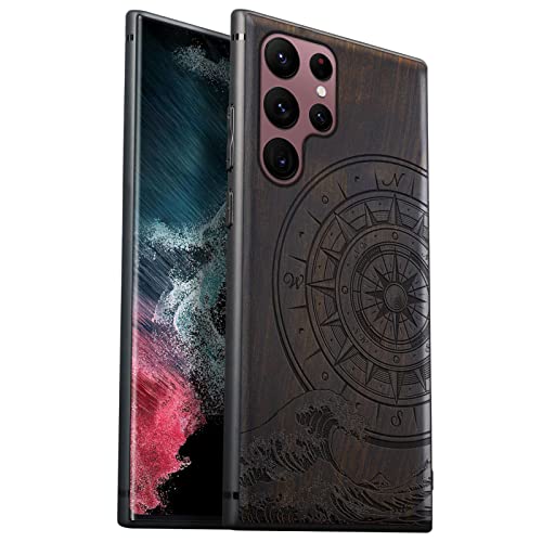 Carveit Custodia in Legno per Samsung S22 Ultra Paraurti Robusto TPU [Legno nero] Antiurto con Protezione Compatibile con Galaxy S22Ultra Cover (La bussola grandi onde)