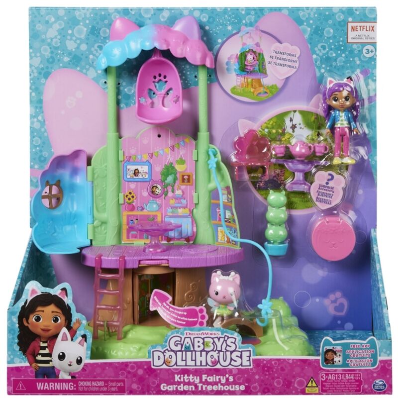 Dai vita al mondo della tua casa delle bambole con la casa sull'albero da giardino di Gabby's Dollhouse Kitty's Fairy. Questa bellissima casa sull'albero per bambini è ispirata all'albero di zucchero filato incantato della serie TV. Contiene luci, un baldacchino trasformabile, una stanza segreta, una teleferica, un'altalena, personaggi, accessori e mobili per avventure di gioco. Esplora i due piani della casa sull'albero con Kitty Fee e l'esclusiva bambola Gabby da 7,6 cm. Scopri un baldacchino che si apre per rivelare un'area giochi. Dopo aver esplorato tutte le fantastiche funzionalità, apri la speciale scatola a sorpresa, proprio come fa Gabby nella serie. Troverai un annaffiatoio a sorpresa che potrai utilizzare nella tua storia. Dopo aver aperto la scatola a sorpresa, riempi la Casa sull'albero da giardino con tutti i bellissimi mobili e accessori a tema fatato, come una sedia a dondolo, una scala per salire al primo piano, una sedia e un tavolo da pranzo per le feste in giardino