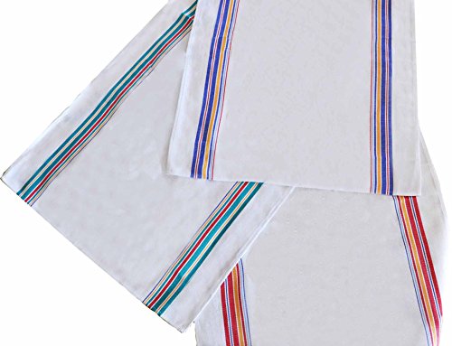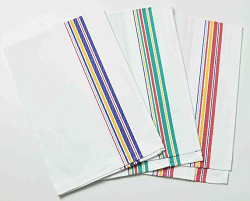 Canovaccio classico in puro cotone, il torcione dei cuochi.Pacco risparmio, set 3 pezzi, strofinacci bianchi dalla trama lavorata a spina pesce e decorati da due fasce laterali a righe, tre colori diversi uno per ogni strofinaccio.Asciugapiatti dal sapore classico e intramontabile, accessoriato di occhiello per appenderlo dove ti fa piu' comodo. Composizione 100% cotoneLavabile in lavatriceMade in Moldavia.