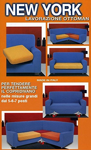 Un copridivano prodotto in Italia dall'ottimo peso e dalle misure cosi' generose da arrivare a coprire fino ad un 7 posti.Il suo tessuto bielastico lo rende pratico per una vestizione veloce ed una buona adattabilita' a varie forme di divano, lo proteggera' rivestendolo come un guanto e rimarra' fermo anche nelle misure piu' lunghe grazie a delle mollettine di cui e' fornito (dal 5 posti in su ) e che ti permettera' di fermarlo ai piedi.Un modello caratterizzato da diversi accorgimenti tecnici