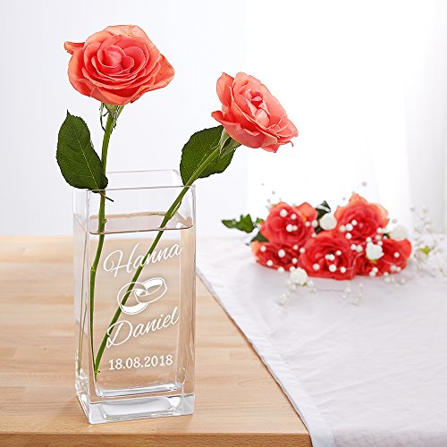 Casa Vivente Vaso da Fiori in Vetro con Incisione Personalizzata con Nomi e Data, Motivo FEDI Nuziali, Vasi da Interno, Idee Regalo Originali per Sposi, Decorazioni Matrimonio, Anniversario