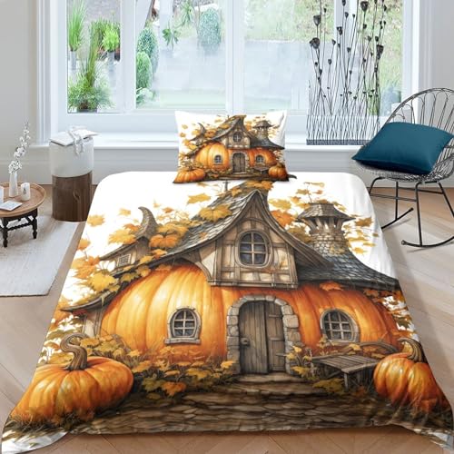 La casa delle zucche Set Da 2 Pezzi Di Biancheria Da Letto Con Effetto Halloween 3D,copripiumino, Lenzuolo E Federe Microfibra Set Di Biancheria Da Letto Per Adolescenti Single(135x200cm)