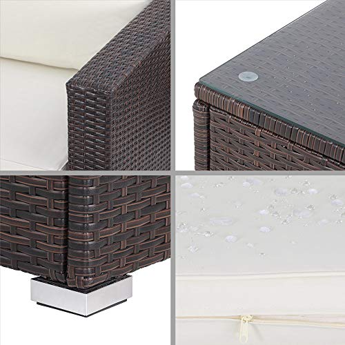 RESISTENTE - Il polyrattan resistente alle intemperie è repellente allo sporco, resistente ai raggi UV e particolarmente facile da pulire. Questo rende il set rattan da esterno adatto sia per interni che per esterni. Dotate di una pratica cerniera, le fodere possono essere facilmente rimosse e lavate quando sono molto sporche.
