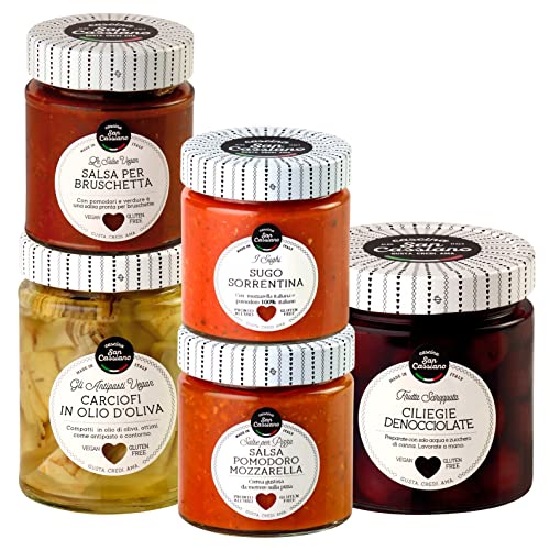 Il kit contiene: 1x Salsa Pomodoro e Mozzarella per Pizza 190g 1x Carciofi 280g 1x Sugo alla Sorrentina 190g 1x Salsa per Bruschetta 130g 1x Ciliegie Denocciolate Sciroppate 410g - 5 Vasetti