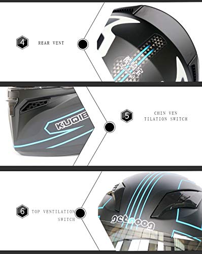 Multifunzione: design con protezione solare a doppio strato, specchietto retrovisore esterno chiaro e ad alta definizione, specchietto retrovisore interno antiriflesso e design dell'interruttore regolabile, può essere azionato con una mano e può essere facilmente installato alla luce solare diretta. Il design dell'interruttore del casco esposto può essere utilizzato come casco integrale o mezzo casco.