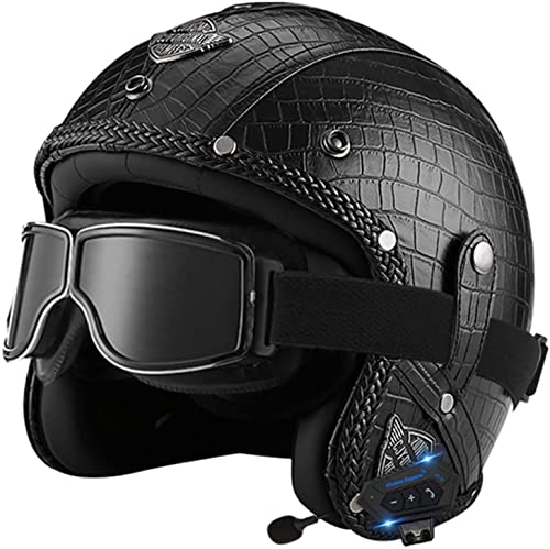 Casco Open Face,Casco Moto Bluetooth Integrato,Mezzo Casco In Pelle PU Retrò Con Occhiali,DOT/ECE Approvato Moto Scooter Crash Jet Helmet 1,M