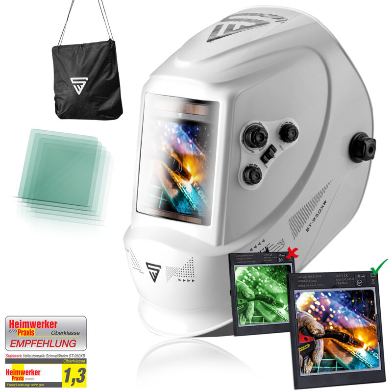 Caratteristiche Modello - Questo casco è adatto ai principianti e soprattutto ai saldatori e ai tagliatori al plasma avanzati e professionali. Ha tutte le caratteristiche e le opzioni di regolazione necessarie per questo tipo di lavoro. Potete trovare altri modelli nel nostro negozio. Funzione 3 in 1 - Il casco multifunzione è adatto alla saldatura, al taglio al plasma, alla molatura e al taglio. La modalità desiderata (saldatura, taglio, molatura) può essere impostata in modo rapido e semplice. Classe ottica - Valori massimi in tutte le classi 1/1/1/1. Massima classificazione nelle classi qualità ottica, dispersione della luce, fluttuazione della trasmissione della luce e dipendenza dall'angolo di trasmissione della luce. Livelli di oscuramento - Il casco per saldatura completamente automatico può essere regolato da DIN5 a DIN13. Questo offre la massima sicurezza per quasi tutti i processi di saldatura. Dati tecnici Modello di casco / filtro: ST-950XW Dimensioni del filtro: 133 mm x