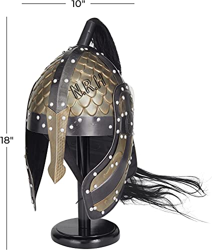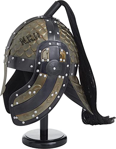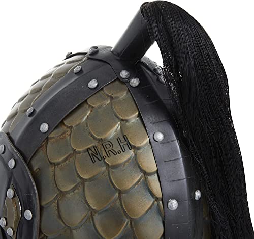 CARATTERISTICHE CASCO IRREGOLARE: Questo casco greco con supporto cimelio presenta un casco guerriero del vecchio mondo progettato con scale di drago, borchie in metallo arrotondate e uno stemma del casco della coda di cavallo