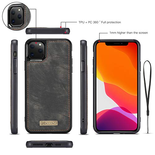 CaseMe per iPhone 11 PRO Retro Pelle Portafoglio Custodia, Fatto a Mano 2in1 Staccabile Flip Cerniera Custodia con Slot per schede e Magnetica Back Cover Custodia (Nero)