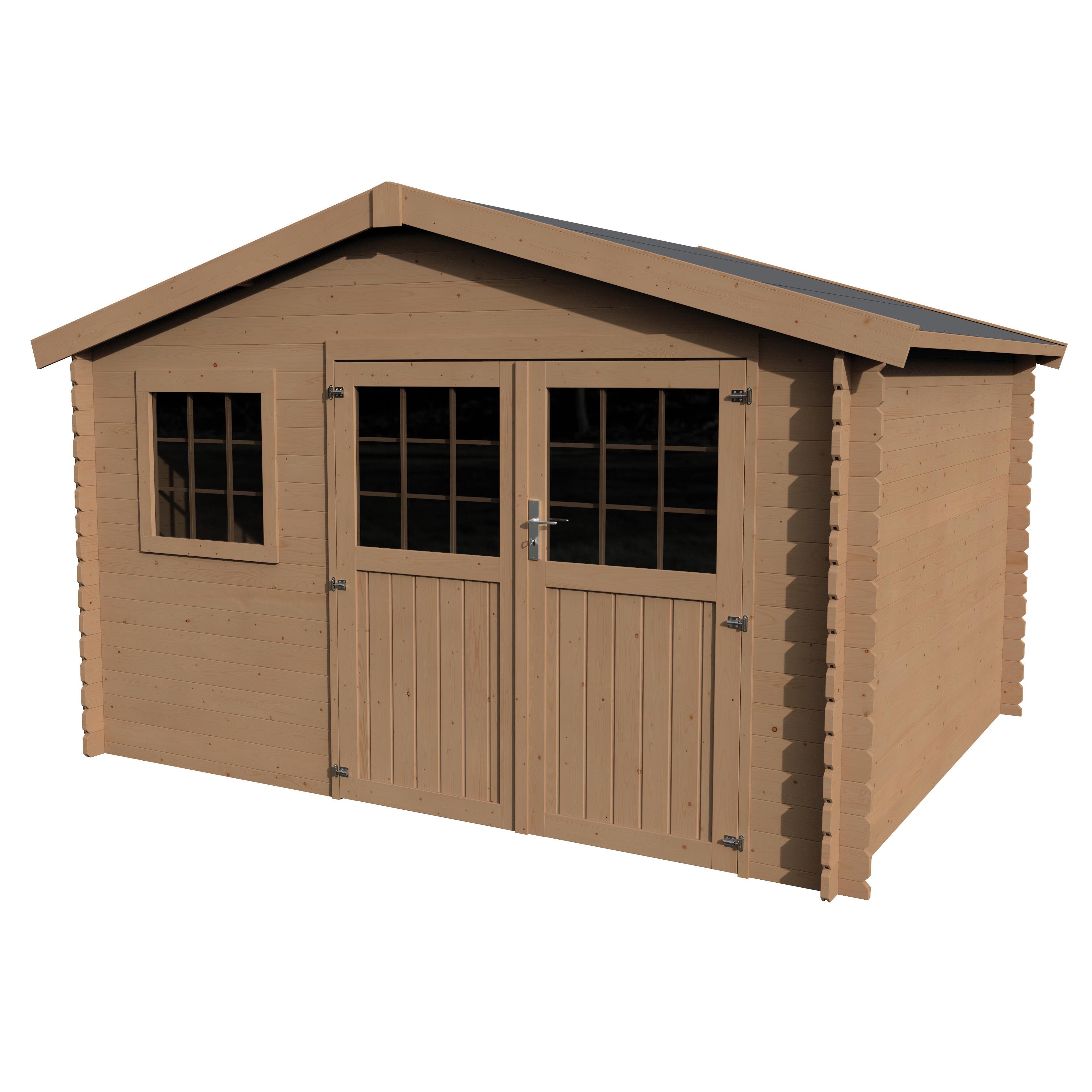 In legno grezzo di abete del nord, L 386,2 x P 302,5 cm, struttura Blockhouse, altezza colmo 240 cm. Ideale per realizzare una stanza in più da utilizzare tutto l'anno. Materiale robusto e naturale, è decorabile e personalizzabile. Pavimento opzionale codice 36560636. Il lucernario e le porte a vetri favoriscono il passaggio della luce garantendo un ambiente luminoso, ideale per il ricovero delle piante nel periodo invernale. La doppia porta permette il ricovero anche di attrezzi di grandi dimensioni e mobili da giardino