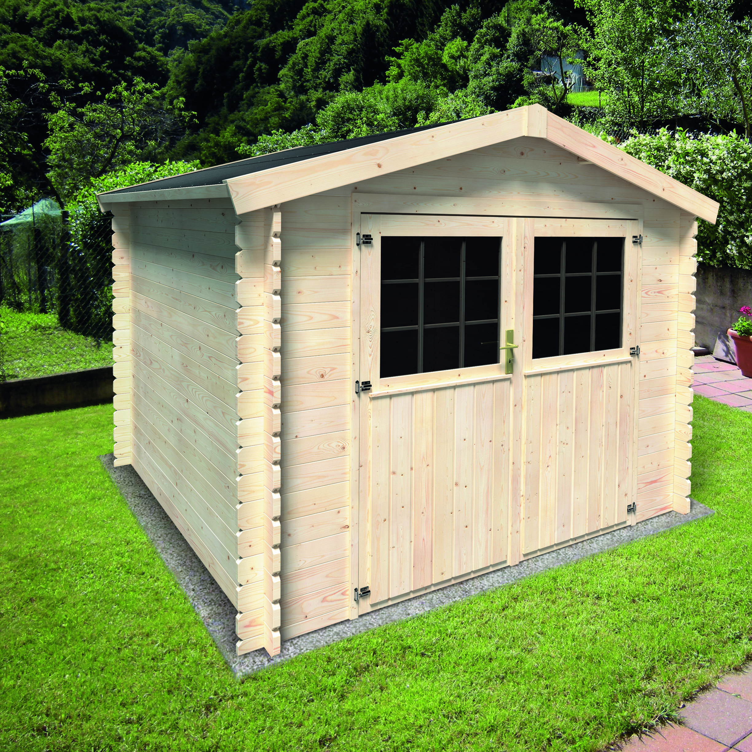 In legno grezzo di abete del nord, L 288,9 x P 272,9 cm, struttura Blockhouse, altezza colmo 228,5 cm. Ideale per realizzare una stanza in più da utilizzare tutto l'anno. Materiale robusto e naturale, è decorabile e personalizzabile. Ampia apertura. La doppia porta permette il ricovero anche di attrezzi di grandi dimensioni e mobili da giardino
