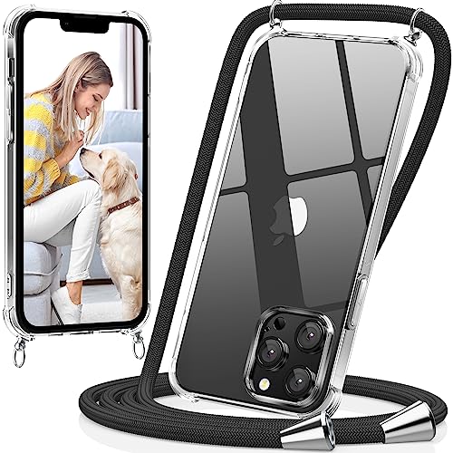 Caslord Custodia con Collana per iPhone 13 Pro 6.1'', Cover Trasparente TPU con 2 regolabili Cordino, iPhone 13 Pro Case con Laccio Tracolla, Nero + Rosa