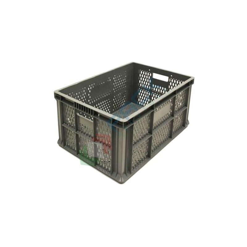 CASSETTE SOVRAPPONIBILI NORMA EUROPA FORATE, PER ALIMENTI Contenitore in plastica sovrapponibile Norma Europa, capacità 65 Lt, con misura esterna: 600 L x 400 P x 330 H mm e misura interna: 569 L x 366 P x 315 H mm. La cassetta presenta base, pareti forate e maniglie passanti. Contenitore realizzato in PP (Polipropilene). Colore grigio chiaro. Scatola in plastica idonea al contatto con alimenti. Le cassette formato EURO sono distinguibili da altezza, misura della base, dimensioni esterne ed interne. E' possibile scegliere tra modelli con maniglie passanti che ne agevolano la presa e la movimentazione e sono indicate per il trasporto di carichi pesanti;