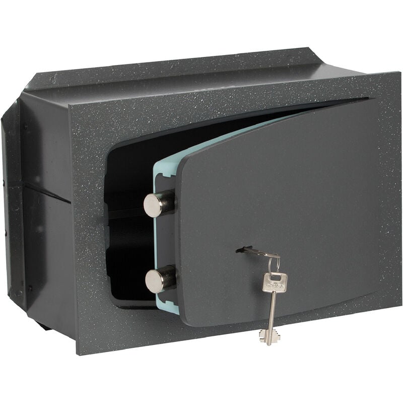 Catenacci girevoli in acciaio nichelato Ø 22 mm. Speciale verniciatura a forno ad alta resistenza contro la corrosione. Piastra di protezione della serratura in acciaio carbonitrurato, serratura a meccanismi fissati direttamente sullo sportello della cassaforte. Assembalggio dei componenti di tenuta con saldature robitizzate. Dimensioni (LxHxP).