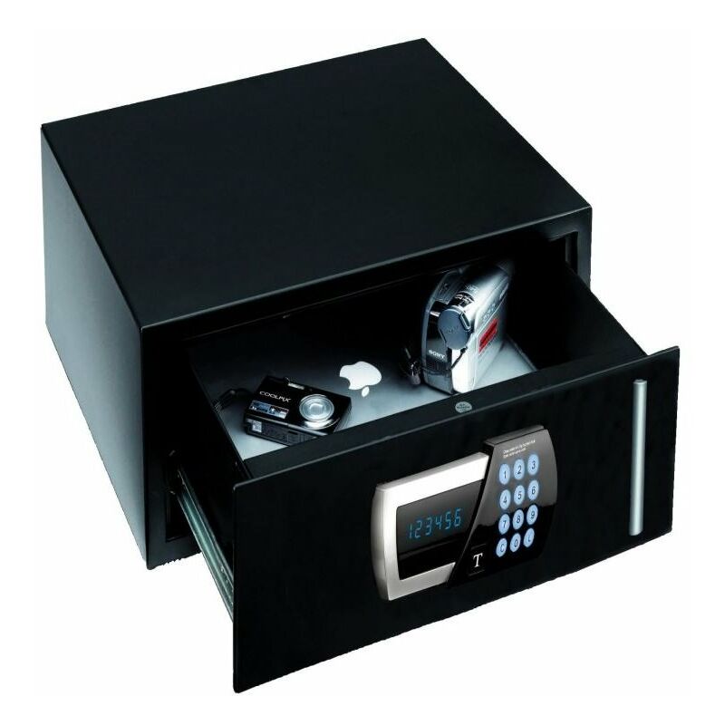 Cassaforte Hotel a mobile della Technomax della serie Hotel modello DS/2HN Apertura a combinazione elettronica digitale motorizzata con display a led Scarica la scheda tecnica Caratteristiche Tecniche: Spessore porta: 5 mm. Spessore corpo: 2 mm. Cassetto scorrevole su guide telescopiche. Serratura motorizzata controllata da un congegno elettronico ad alta affidabilità. Illuminazione della tastiera a LED blu alla digitazione di un qualsiasi tasto. Codice Cliente programmabile da 4 a 6 cifre. Segnalazione di tutte le funzioni mediante display a LED colore blu a 6 posizioni. Possibilità di programmare il codice Master ad uso esclusivo dell'Albergatore. Serratura a chiave per apertura di emergenza (identica per tutte le casseforti dello stesso hotel). Visualizzazione a display degli ultimi 100 eventi (apertura, chiusura). Tappetino sulla base. Fori di ancoraggio sullo schienale e sulla base (2+4). Tasselli per il fissaggio in dotazione. Verniciatura a polvere termoindurente colore nero.