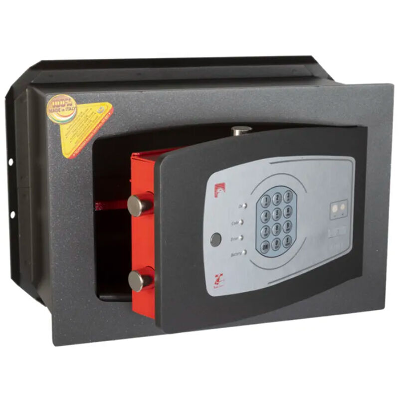 Cassaforte a muro "Gold plus Trony" modello ATT/4P e modello ATT/4P/AC con allarme anti-coercizione! Caratteristiche tecniche: Combinazione Elettronica Digitale Motorizzata Inserti speciali anti-taglio sulla parte interna della porta per offrire una maggiore resistenza agli attacchi utilizzando il disco da taglio Serratura motorizzata certificata UNI EN 1300, controllata da un congegno elettronico ad alta affidabilità, dotato di memoria non volatile Apertura di emergenza con serratura certificata UNI EN 1300 a chiave doppia mappa con profilo speciale, duplicabile con la carta di proprietà numerata per prevenire la duplicazione non autorizzata delle chiavi Ritardo di apertura programmabile da 0 a 99 minuti Illuminazione interna a LED all'apertura della porta Alimentazione interna con batterie alcaline da 1,5V (non incluse) Contatti per batteria esterna ricavati direttamente sulla tastiera Catenacci in acciaio nichelato, girevoli, Ø 22 mm. Profili speciali in acciaio posti sulla