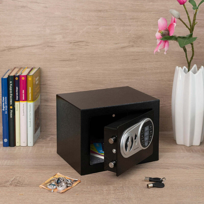 Questa cassaforte con chiusura elettronica è una soluzione affidabile per conservare oggetti di valore in modo sicuro. Con una combinazione numerica a quattro cifre e un'opzione di apertura manuale con due chiavi, è una soluzione di sicurezza ideale sia per la casa che per l'ufficio. Sono inclusi un piccolo tappetino e accessori di montaggio per il montaggio a parete. - Robusta costruzione in acciaio rinforzato con una porta spessa e ganci incorporati. - Doppio sistema di sicurezza con opzione di apertura digitale e manuale. - Possibilità di impostare un codice personale a quattro cifre per una maggiore sicurezza. Questa cassaforte digitale è progettata per fornire la massima sicurezza possibile. Realizzato in acciaio rinforzato con una porta spessa, offre una protezione affidabile per i tuoi oggetti di valore. Le sue dimensioni compatte facilitano la collocazione in vari ambienti. La combinazione elettronica fornisce un ulteriore livello di sicurezza, mentre le chiavi di emergenza