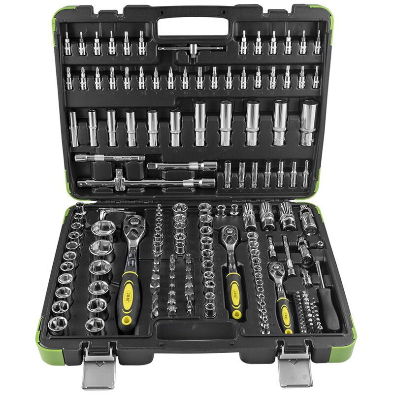 Set chiavi a bussola 179 pezzi Finitura satinata Attacco 1/4″ - 3/8″- 1/2″ con 6 bussole in cassetta di plastica antiurtoUtensili da 1/2″: 17 bussole metriche esagonali: 10,11,12,13,14,15,16,17,18,19,20,21,22,24,27,30,32mm5 bussole metriche esagonali lunghe: 16, 17, 18, 19 e 22 mm.2 prese Torx: E20, E24.2 barre di estensione: 125 mm e 250 mm.1 giunto cardanico1 adattatore per testina (8 mm).2 prese per candele: 16, 21 mm.1 cricchetto a 72 denti con espulsore a bussola.7 chiavi a brugola: 1.27, 1.5, 2, 2.5, 3, 4 e 5 mm. Strumenti da 1/4″:13 bussole metriche esagonali: 4, 4,5, 5, 5,5, 6, 7, 8, 9, 10, 11, 12, 13, 14 mm.7 bussole metriche esagonali lunghe: 4, 5, 6, 7, 8, 9, 10 mm.5 prese Torx: E4, E5, E6, E7, E8.2 barre di prolunga: 50, 100 mm1 maniglia scorrevole1 giunto cardanico1 adattatore per testina (6 mm)1 impugnatura per cacciavite1 cricchetto 72 denti con espulsore30 bussole per cacciavite:Piatte: 4, 5,5, 6,5 e 7 mm.Phillips: #0, #1, #2.Doppio Phillips: #0, #1 e #2.Allen: 3, 4, 5