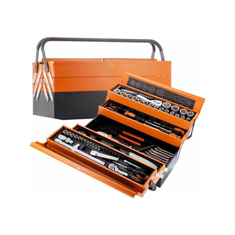 Cassetta attrezzi completa di 85 utensili a 5 scomparti chiavi cricchetti pinze Cassetta a 5 scomparti completa di 85 utensili. Contenuto: Bussole 1/2: 10-11-12-13-14-15-16-17-18-19-20-21-22-23-24-27-30-32mm Bussole 1/4: 12 1/4: 4, 4,5, 5, 5,5, 6, 7, 8, 9, 10, 11, 12, 13 mm 1 Cricchetto da 1/2 72 denti 1 Cricchetto da 1/4 72 denti Prolunga 1/2 Prolunga 1/4 Prolunga 1/2 a T 1 Adattatore a snodo 1 impugnatura porta inserti 6 inserti da 1/4 (taglio - croce) 5 cacciaviti: 5x75, 6x100, 8x150, PH1x75, PH2x100mm Pinza a pappagallo Pinza a scatto Pinza a becco lungo Pinza classica Metro da 5M Taglierino con 10 lame 9 chiavini esagonali: 1,5,2,2,5, 3,4,5,6,8, 10mm. 12 chiavi 6,8,9,10, 11,12,13,14,15,16,17, 19 mm 1 cassetta in metallo