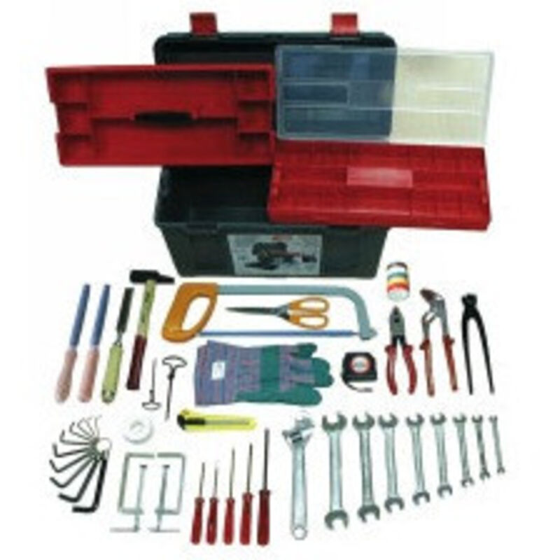 Cassetta degli attrezzi con ripiano e scatola portaoggetti (480 x 258 x 250 mm), 1 martello da carpentiere (22 mm), 1 pinza per pompa dell'acqua (250 mm), 1 pinza universale (160 mm), 1 pinza russa (220 mm), 1 seghetto, 1 taglierino da 18 mm, 1 paio di forbici, 5 cacciaviti (3 piatti, 2 Phillips), 8 chiavi doppie (da 6 a 22 mm), 10 chiavi a brugola (da 1,5 a 10 mm), 1 chiave regolabile ( 250 mm), 1 lima 1/2 tonda 1/2 morbida, 1 raspa bastarda tonda 1/2, 1 scalpello per legno (20 mm), 2 succhielli (3 e 5 mm), 2 presse ( 100 mm), 1 rotolo di Teflon, 5 nastri adesivi multicolori, 1 metro (3m), 1 paio di guanti per la manipolazione.