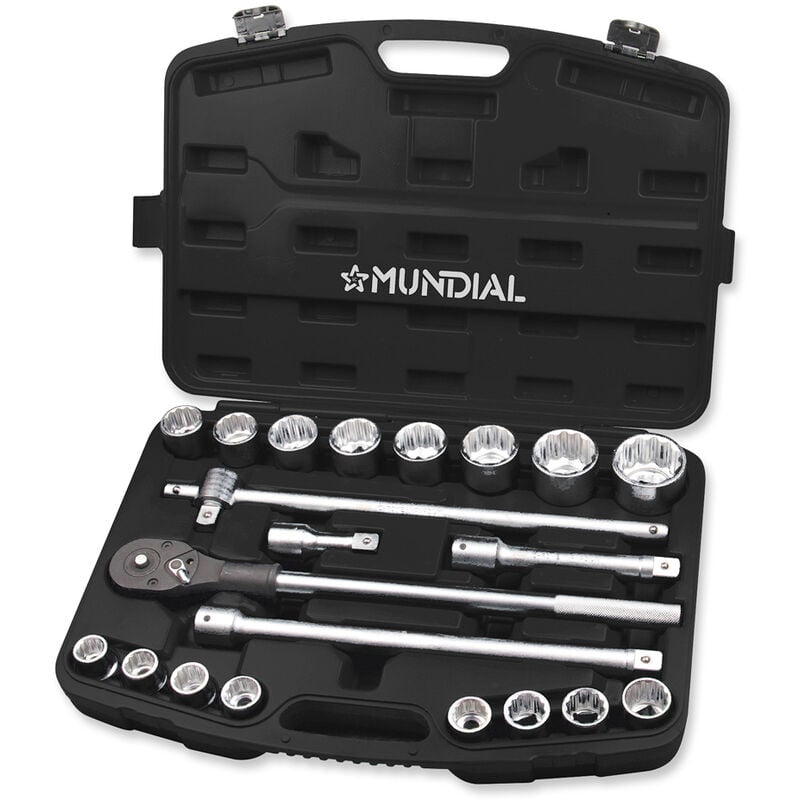 Cassetta 21 bussole completa MUNDIAL Contenuto: 1 x Chiave a cricchetto reversibile sgancio rapido attacco: 3/4″ 1 x Leva a T 3/4 Misure:19 - 21 - 22 - 23 - 24 - 26 - 27 - 29 - 30 - 32 - 35 - 36 - 38 - 41 - 46 - 50 - 100 - 200 - 400 mm Prodotto di qualità LA FATTURA VIENE EMESSA PER IMPORTI SUPERIORI A € 20 E VA RICHIESTA AL MOMENTO DELL'ACQUISTO