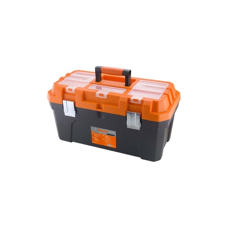 Cassetta portattrezzi, corpo in robusto materiale plastico. robusta struttura nervata, manico a scomparsa, vassoio interno estraibile. chiusura a scatto con possibilità di lucchetto e interno diviso in scomparti