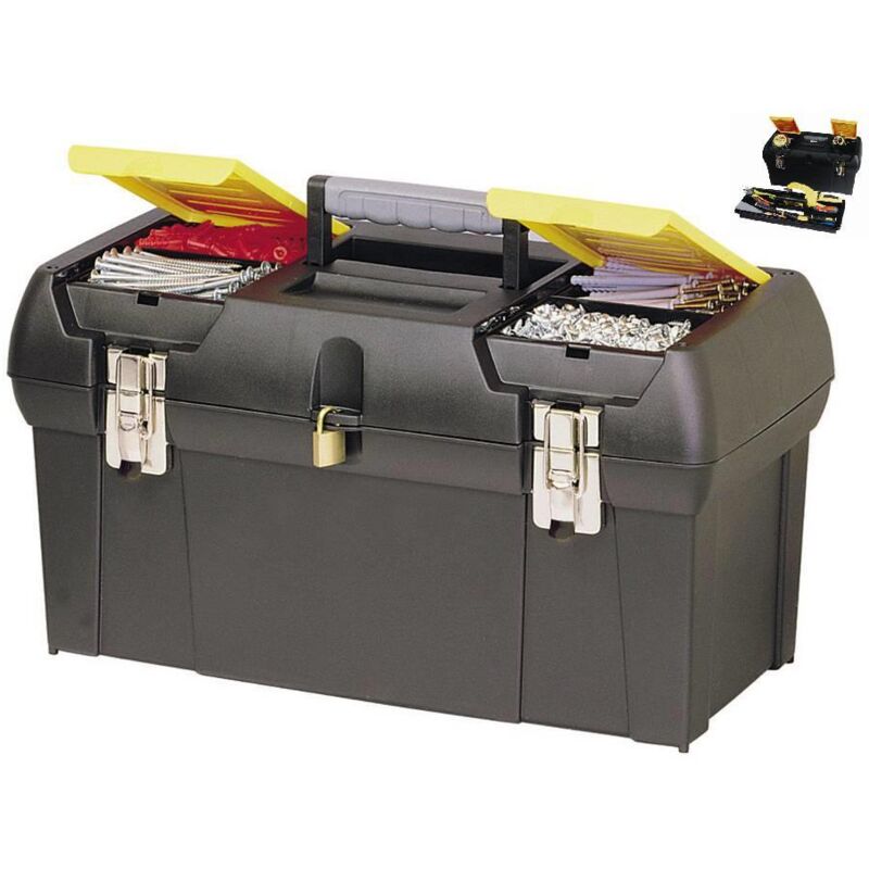 Descrizione del prodotto - Robuste clip in metallo- 2 organizer sul coperchio per riporre viti/piccole parti- Maniglia articolata- Portautensili integrato e rimovibile- Lucchetto per i codici articolo 92-066 e 92-067. Caratteristiche Ampie clip in metallo: assicurano una chiusura stabile e una maggiore resistenza alle cadute. Maniglia integrata: facilita il carico e lo scarico della scatola quando è piena. Buona capacità: grazie alle sue ampie dimensioni, può contenere un gran numero di utensili. Ergonomica: è dotata di un portautensili rimovibile per utensili manuali come regoli pieghevoli, cacciaviti o pinze. Vantaggi Robusto e durevole: presenta un design robusto in plastica con ampi fissaggi in metallo per garantire una migliore resistenza alla corrosione e agli urti e una maggiore durata. Pratico: dispone di due organizer sul coperchio per riporre viti e altre piccole parti come le punte dei cacciaviti. Comodità d'uso: la maniglia articolata garantisce un'ottima presa e una