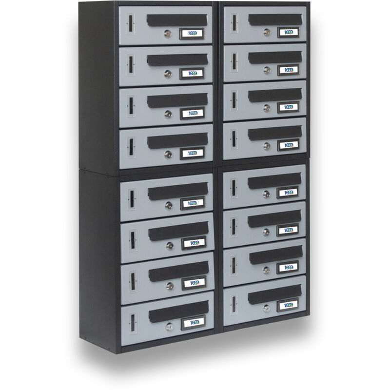 CARATTERISTICHE CASSETTA POSTALE CONDOMINIALE 16 POSTI CM 90X17X84H - MODELLO MODULAR - La cassetta postale condominiale Modular a 16 posti è la soluzione perfetta per soddisfare le esigenze di un condominio di grandi dimensioni. Con le sue dimensioni di 90 cm di larghezza, 17 cm di profondità e 84 cm di altezza, questa cassetta postale offre una grande capacità di archiviazione per la posta degli abitanti del condominio. La finitura Grigio Moderno conferisce alla cassetta un aspetto moderno ed elegante, che si adatta perfettamente a qualsiasi tipo di edificio. La cassetta postale condominiale Modular dispone di 16 coppie di chiavi numerate univoche, in modo da garantire la massima sicurezza della posta degli inquilini. L'inclusione dei due kit (Targhette portanome e Portachiavi in omaggio) conferisce un tocco distintivo e altamente funzionale a ogni cassetta condominiale. Le finestrelle d'ispezione consentono di verificare facilmente se la posta è stata consegnata, senza dover aprire