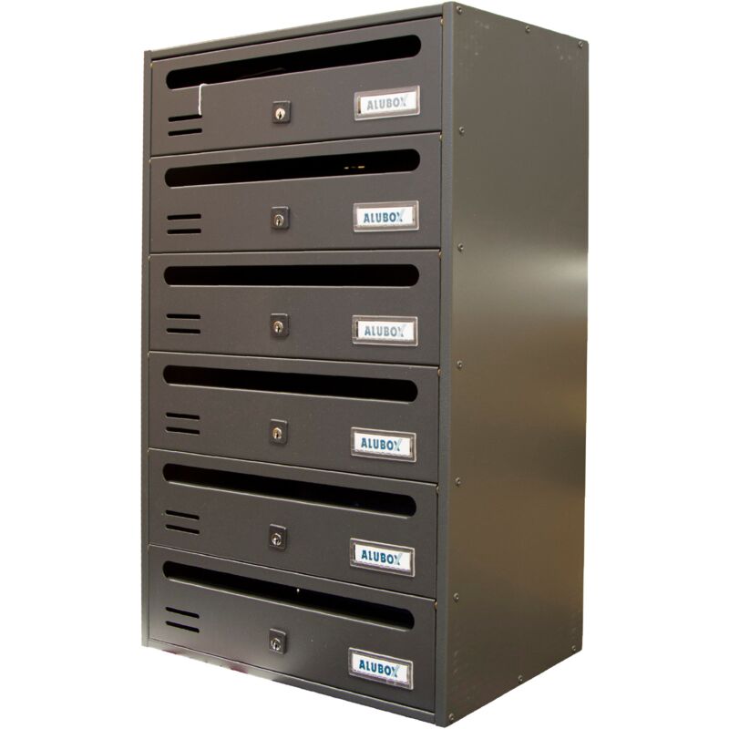 Cassetta Postale in Ghisa 6 Posti Alubox SPECIFICHE: Mod. CUBO/R Art. C 6 R/O corpo in lamiera elettrozincata Serratura a cilindro Con 2 chiavi Finitura ghisa DIMENSIONI: Dimensioni mm 385 x 250 x 630h