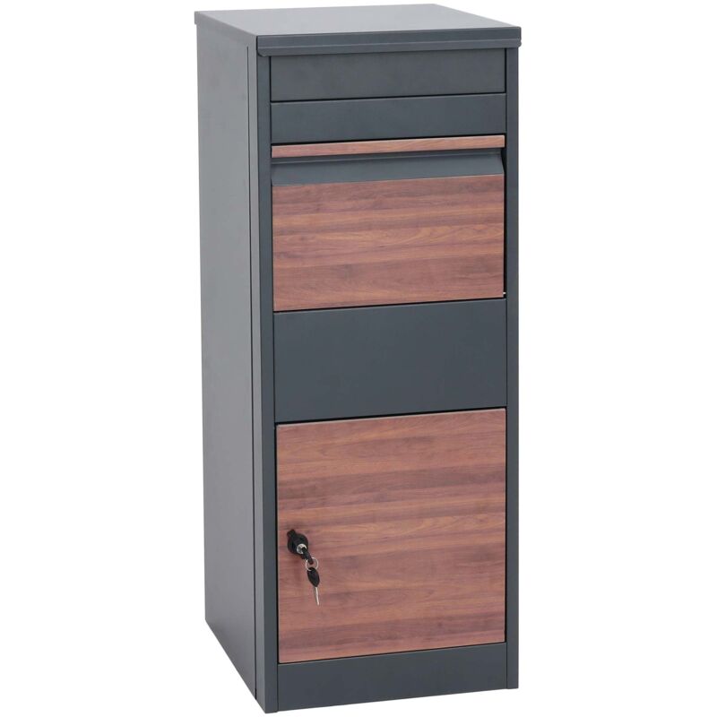Cassetta postale per lettere e pacchi modello HHG-092 acciaio zincato colore ANTRACITE e LEGNO SCURO Se in futuro vuoi evitare lunghe code allo sportello postale, abbiamo la cosa giusta per te: Questa cassetta postale è adatta alla ricezione di lettere e di pacchi di piccole e medie dimensioni (fino a 36,5x33,5x25cm) Il sistema prevede l'apertura dello sportello per inserire il pacco, non appena lo sportello viene chiuso, il pacco cade nella parte inferiore della cassetta, dove il pacco non può essere preso senza prima dover aprire lo sportello con serratura. E' possibile fissare la cassetta postale al terreno mediante i fori presenti sulla piastra della base e utilizzando il materiale incluso nella consegna. Proponiamo questo articolo in diverse versioni. adatto per lettere e pacchi di piccole e medie dimensioni (fino a 36,5x33,5x25cm) con serratura con materiale e fori per il fissaggio al pavimento sistema di deposito sicuro peso 23kg materiale: acciaio zincato dimensioni (ca.)