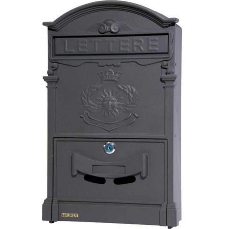 Elegante cassetta postale in alluminio pressofuso verniciato, con serratura cilindro e due chiavi duplicabili in dotazione - Adatta per uso esterno Confezione: 1 PZ Dimensione 26x9x41H cm. Materiale Alluminio Colore Nero