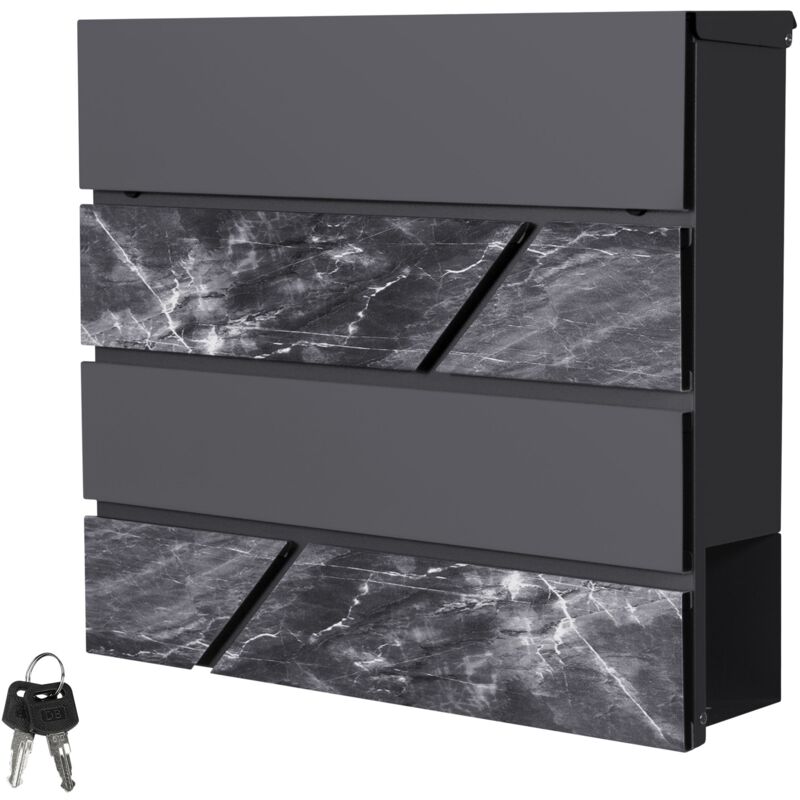 Descrizione del prodotto: La posta è arrivata! La tua posta verrà lasciata al sicuro e all'asciutto con questa elegante cassetta delle lettere. La cassetta della posta da parete di alta qualità è realizzata in acciaio resistente alle intemperie. Grazie alla combinazione di antracite e aspetto marmo sui quattro montanti, si adatta perfettamente a qualsiasi parete della casa ed è un vero colpo d'occhio. La cassetta postale viene fornita con 4 viti e 4 tasselli per il fissaggio. Per raggiungere facilmente la tua posta, ricevi 2 chiavi per la grande cassetta della posta pieghevole. Ti piace leggere i giornali? La buca delle lettere ha uno scomparto per giornali integrato, dove il giornale può essere inserito asciutto e pulito. Caratteristiche: Elegante aspetto legno Con scomparto per giornali Set di montaggio incluso Un colpo d'occhio per la parete della casa In acciaio resistente alle intemperie Dati tecnici: Materiale: Acciaio Colore: Antracite Dimensioni (LxHxP): ca. 37 x 36,5 x 11 cm