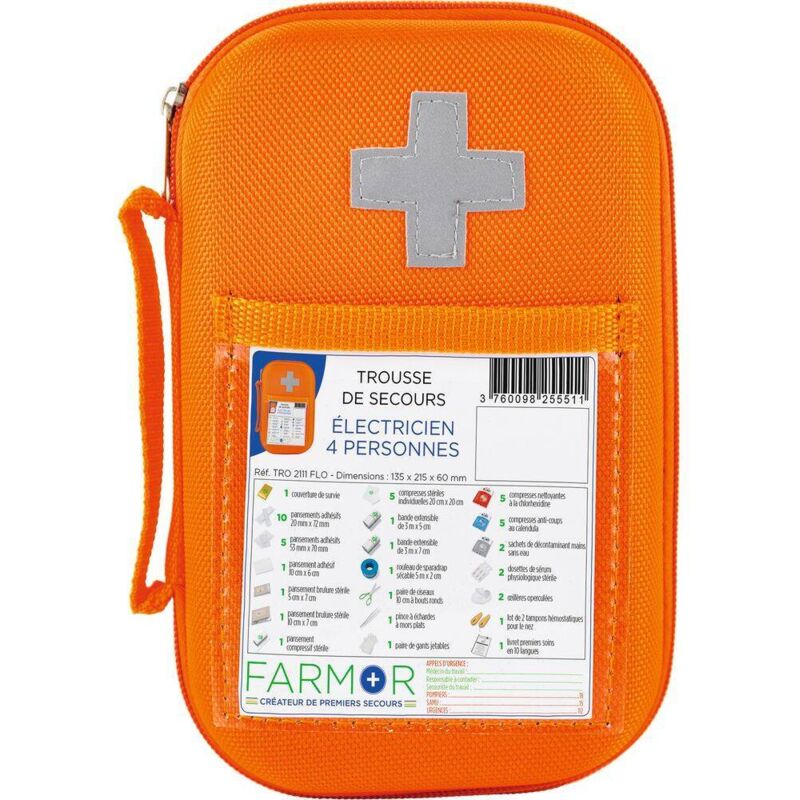 Farmor - Cassetta di pronto soccorso per elettricisti da 4 persone in EVA/PU arancione fluorescente - TRO 2111 FLO Chiusura a cerniera Clip da cintura con cinturino Tasche multiple - Maniglia EVA arancione fluorescente con croce retroriflettente Dimensioni: 215 x 135 x 60 mm Peso: 340 g Consegnato confezionato Composizione: 1 coperta di sopravvivenza 10 bende adesive 20 mm x 72 mm 5 bende adesive 53 mm x 70 mm 1 benda adesiva 10 cm x 6 cm 1 medicazione per le ustioni 5 cm x 7 cm 1 medicazione per ustioni 10 cm x 7 cm 1 medicazione a pressione sterile 5 compresse sterili individuali 20 cm x 20 cm 1 benda elastica 3 m x 5 cm 1 benda elastica 3 m x 7 cm 1 rotolo di gesso frangibile 5 m x 2 cm 1 paio di forbici a punta rotonda da 10 cm 1 paio di pinze per schegge con ganasce piatte 1 paio di guanti monouso 5 Tamponi di pulizia alla clorexidina 5 impacchi alla calendula contro il gonfiore 2 bustine di gel decontaminante per mani senza acqua 2 dosi di siero fisiologico sterile 2