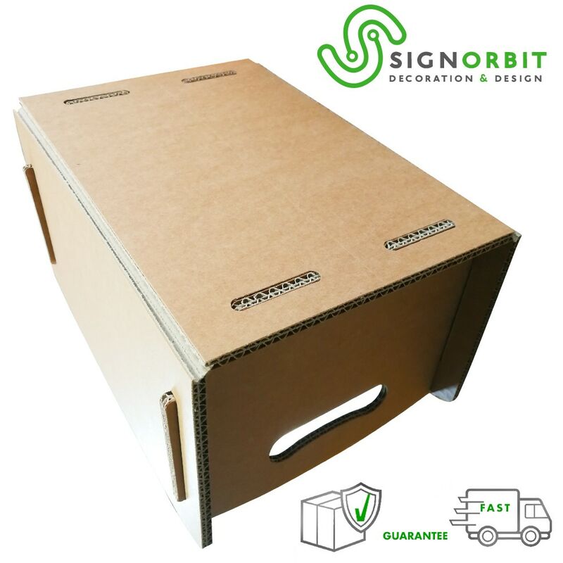Questa cassetta in cartone doppia onda da 7mm con copertine rinforzate è stata pensata per poter contenere oggetti abbastanza pesanti, infatti la sua base di poco più di 930 centimetri quadrati riesce a supportare un peso di 6 kg. Gli incastri e le proporzioni sono stati pensati per conferire robustezza e resistenza alla scatola. Questo contenitore viene fornito completo di separatori a 4 scomparti ma può essere usato anche senza;