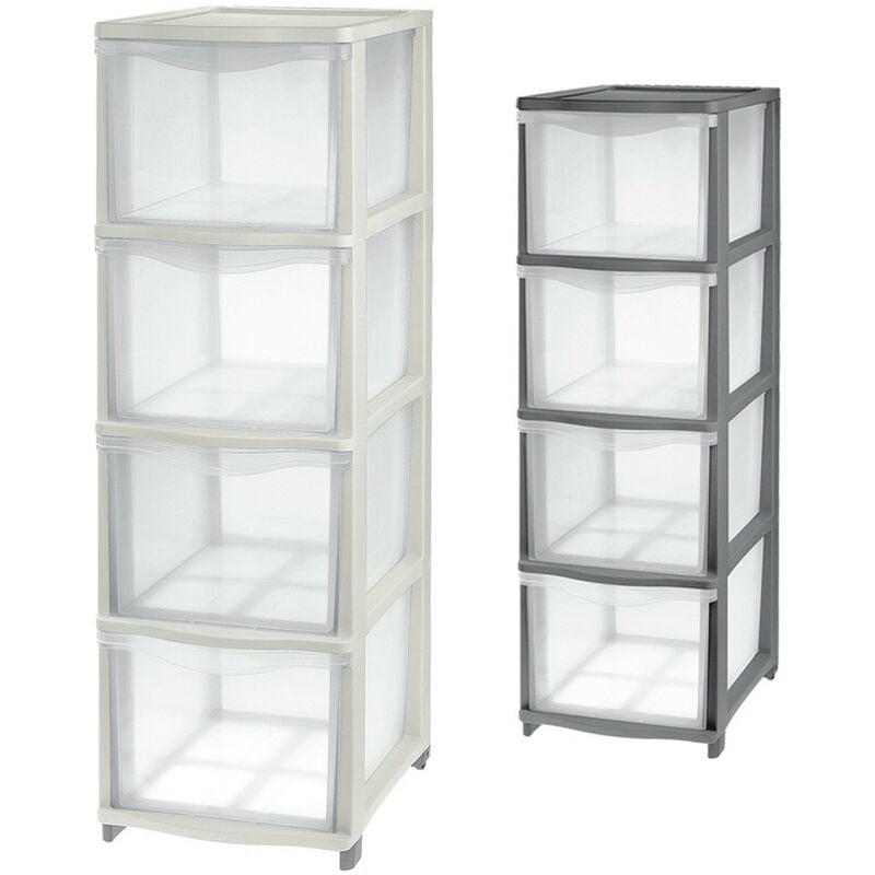 In plastica. a 4 cassetti alti. dimensioni: cm. 26,8x37xh.82,7.colore trasparente/panna