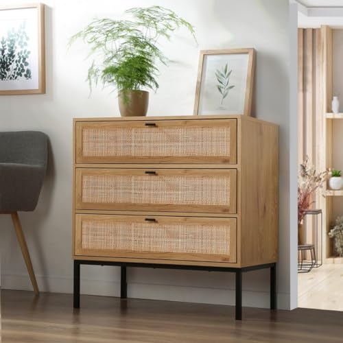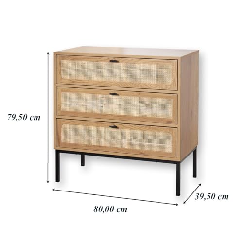Cassettiera a 3 cassetti effetto legno con impagliatura in rattan L80 cm - JAYA