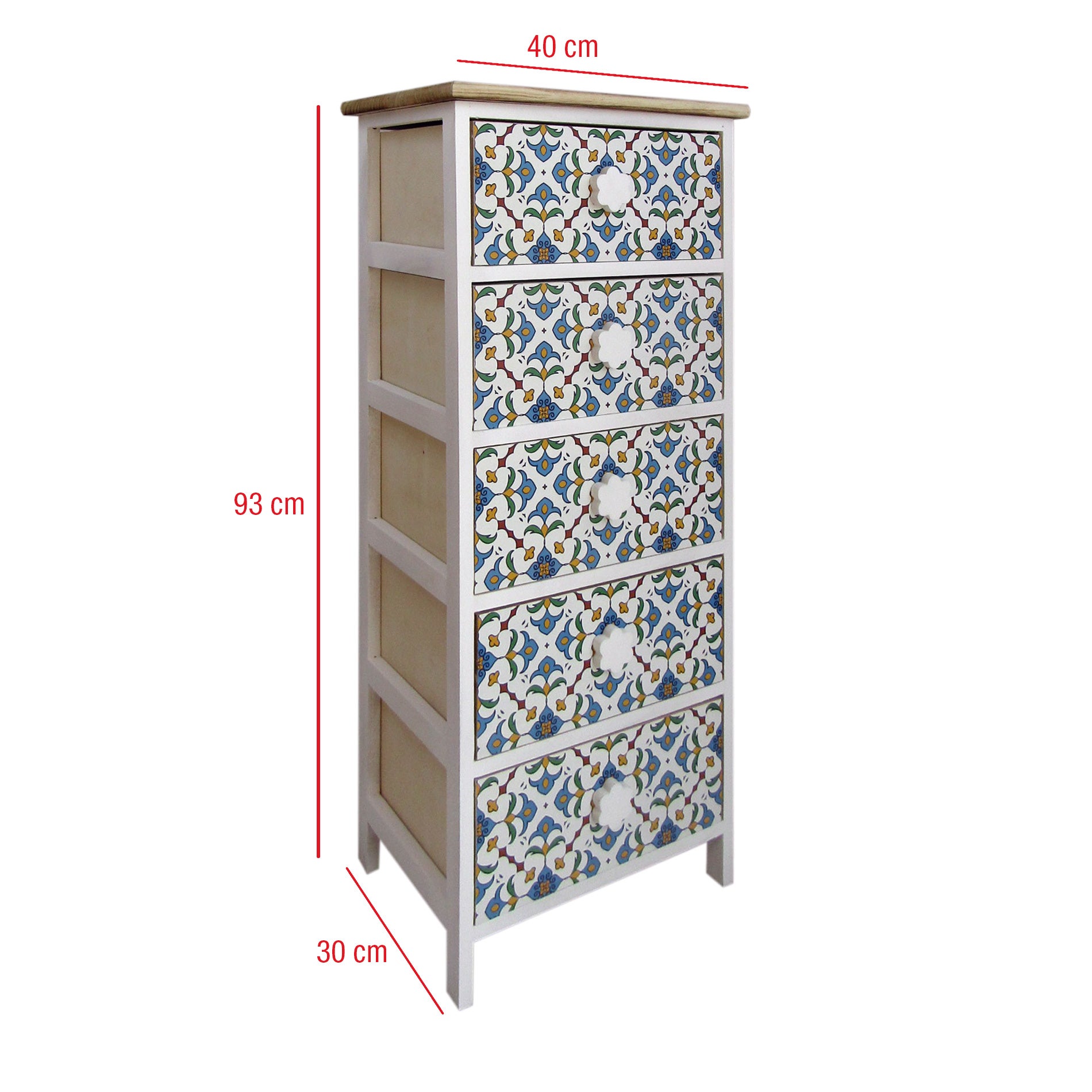 • La cassettiera è un mobiletto versatile, capace di adattarsi ai vari ambienti e alle varie esigenze. Le forme lineari la rendono adatta ai diversi ambienti di casa. Puoi utilizzarla sia come cassettiera da cucina che come mobiletto cassettiera per bagno. Nei cassetti puoi riporre pettini, trucchi, biancheria intima, guanti e sciarpe. Le decorazioni a maioliche dei cassetti creano un piacevole gioco cromatico in contrasto con la struttura dai colori chiari del legno e del bianco. L'intera struttura è in legno naturale, ecologico e a basso impatto ambientale. Riceverai la cassettiera moderna già montata. Estraila dalla confezione e sarà già pronta all'uso. • Dimensioni: H 93 cm x L 40 cm x P 30 cm - Dimensioni cassetti (5): H 14,7 cm x L 33,3 cm x P 25 cm • Colore: Legno chiaro, Blu, Bianco, Giallo, Verde, Rosso • Montaggio: Il mobile arriverà già montato e pronto all'uso • Materiale: Legno di Paulownia. Adatto per bagno, camera da letto, soggiorno. Adatto per riporre piccoli oggetti. Già montato e pronto all'uso. Le sue forme contenute lo rendono perfetto per arredare anche stanze di piccole dimensioni