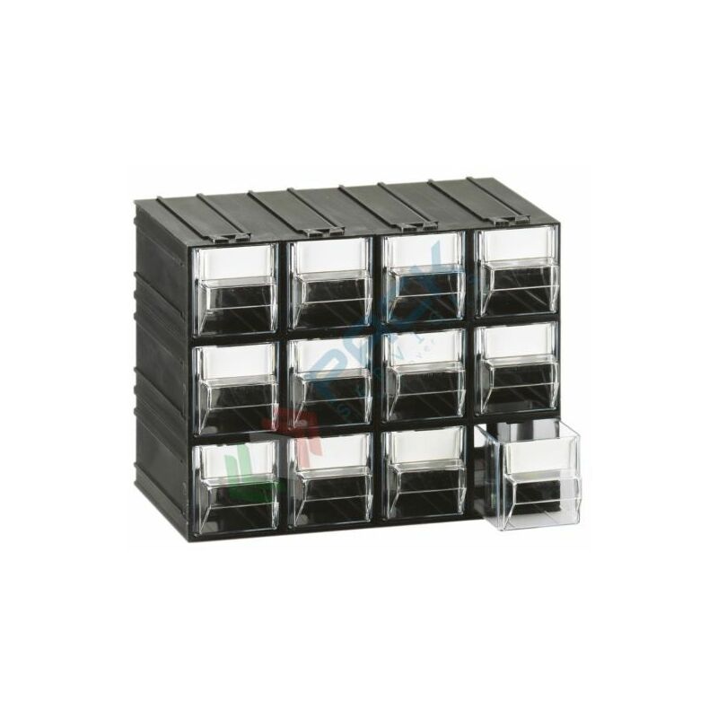 CASSETTIERA PORTAMINUTERIA IN PLASTICA, COMPONIBILE, PROFONDITÀ 225 MM Cassettiera portaminuteria in plastica componibile, costruita in plastica (SPT), Mis. 225 L x 133 P x 169 H mm, con 12 cassetti estraibili trasparenti, peso 1,07 Kg. Il sistema ad incastro della cassettiera portaminuteria permette la realizzazione di vere e proprie pareti attrezzate per la classificazione, organizzazione e stoccaggio di piccoli componenti, di parti di ricambio, viteria, bulloneria, ecc.. Cassettiera portaminuteria in plastica, componibile, profondità 225 mm, con cassettini in plastica trasparente che permettono di avere i piccoli attrezzi e le minuterie sempre visibili, identificabili e facilmente recuperabili. Cassettiera in plastica resistente altamente resistente agli urti. Cartellini e copri cartellini in dotazione standard. Colore trasparente. Caratteristiche Tecniche