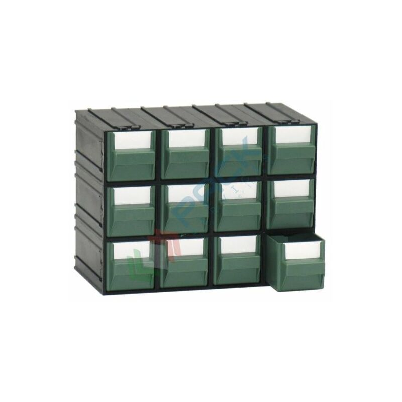 CASSETTIERA PORTAMINUTERIA IN PLASTICA, COMPONIBILE, PROFONDITÀ 225 MM Cassettiera portaminuteria in plastica componibile, costruita in plastica (SPT), Mis. 225 L x 133 P x 169 H mm, con 12 cassetti estraibili verdi, peso 1,07 Kg. Il sistema ad incastro della cassettiera portaminuteria permette la realizzazione di vere e proprie pareti attrezzate per la classificazione, organizzazione e stoccaggio di piccoli componenti, di parti di ricambio, viteria, bulloneria, ecc.. Cassettiera portaminuteria in plastica, componibile, profondità 225 mm, con cassettini in plastica trasparente che permettono di avere i piccoli attrezzi e le minuterie sempre visibili, identificabili e facilmente recuperabili. Cassettiera in plastica resistente altamente resistente agli urti. Cartellini e copri cartellini in dotazione standard. Colore verde. Caratteristiche Tecniche