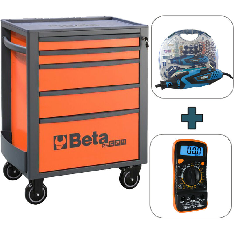 CARRELLO PORTA UTENSILI BETA RSC24/5 La cassettiera portautensili Beta RSC24/5 è l'evoluzione della storica cassettiera C24S, progettata per soddisfare le esigenze di ogni professionista. La struttura ro busta e i materiali impiegati garantiscono un'elevata qualità e una lunga durata ne l tempo. Il design, ispirato al mondo Racing, conferisce alla cassettiera uno stile accattivante e inconfondibile. Modello 5 cassetti da 588x367 mm a estrazione totale, montati su guide telescopi che a sfera: • 2 cassetti altezza 70 mm • 2 cassetti altezza 140 mm • 1 cassetto altezza 280 mm Caratteristiche: • Piano di lavoro rinforzato in ABS, solido e robusto • Piano di appoggio multifunzione con bordi anticaduta e 8 fori per l'alloggiamento dei giravite • 4 ruote Ø 125 mm di cui 2 fisse e 2 girevoli (una con freno) • Serratura di sicurezza centralizzata frontale • Capacità di carico statico pari a 800 kg • Porta flaconi laterale integrato, applicabile su entrambi i lati • Piano dei cassetti protetto