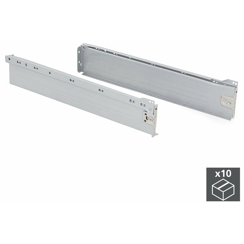 Kit Cassetto Per Cucina Ultrabox A 86 mm P 500 mm Acciaio Grigio Metallizzato 10 Pezzi Emuca Il kit per cassetto da cucina e bagno Ultrabox è composto da profili lateriali in acciaio con guide a rotella, progettate con finiture verniciate in alluminio . È la migliore opzione con il miglior rapporto qualità -prezzo per cassetti da cucina e bagno. Ogni kit include tutti gli accesori per il montaggio di un cassetto: profili laterali, set di guide con caduta e agganci anteriori per il frontalino . Necessita di pannelli tagliati a misura per il fondo e la schiena oltre al frontalino del cassetto. Gli aggangi di fissaggio del frontalino permettono la regolazione eccentrica ± 2 mm verticale. Questi agganci sono già montati sul lato della sponda in acciaio. Cassetto di acciaio composto da due lati e guide a rullo con chiusura a caduta. Altezza del profilo 86 mm e profondità 500 mm. Il fondo non necessita meccanizzazione. capacità di fissaggio migliorata dall'aggancio sul profilo. Si serve di